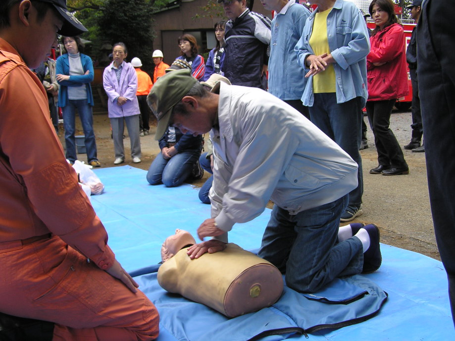 11月に入り、寒さを感じる季節を向かえた11月6日(日)に小園1区2区3区7区の合同自主防災訓練が子之社境内にて実施されました。訓練に参加された主婦は簡易トイレの組み立て訓練を行ないながら、防災はどれも大事なことですがやっぱりトイレがないとと真剣で話しておりました。となりにいた年配の男性はでもの腫れ物ところ嫌わずいざとなったら、どこでも・・・と話しておりました。女性と男性の違いなのでしょうね。トイレが必要になるには、まず、災害から身を守ることが大前提です。自分の命は自分で守る、地域は地域が守るを合言葉に訓練を重ね、いざと言うときに備えることが大切なことですね。 防災訓練は昨年と同様にバケツリレー、消火器の使い方、心配蘇生法、三角巾による止血方法等を行ないました。 バケツリレーはAB二組に別れ火元を想定したタンクへどちらが早く満タンにできるかで競いました。水汲みをされた方が男性だったためか満タンのバケツに重いよなどの声も聞こえましたが連携プレーもあざやかにすぐにタンクは満タンになりました。参加者は、1区2区3区7区合わせて70名でした。訓練には、綾瀬市および早園分団の協力と婦人防火クラブの方々のお手伝いがありました。 |