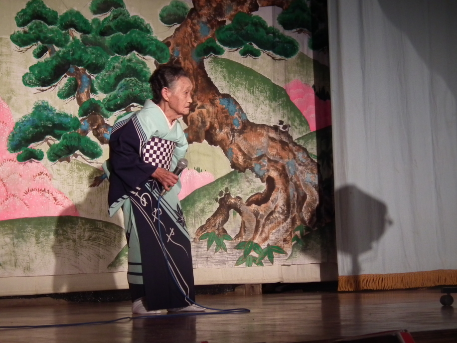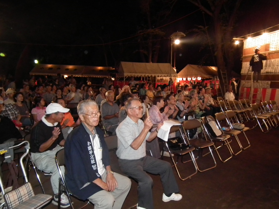 午後6時からははやし連の皆さんによる迎え太鼓で余興が始まり、各区代表の面々が日頃鍛えた喉を披露しておりました。7時過ぎからは、被災された岩手、宮城、福島の皆さんが一日も早く本当の笑顔が取り戻せるようにと応援歌で勇気付けている「榎ありささん」と厚木出身の「井上まりこさん」の熱唱と踊りが子之社の境内に響き渡りました。その後も地域の皆さんの熱唱が続き、お開きは送り太鼓で帰路に着く皆さんの安全を祈っておりました。
