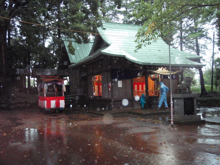 激しい雨音が小園に響き渡った午前5時、綾瀬市に大雨警報が発令されてしまいました。社務所に集まった役員からは仕方ないなー≠ニの声があちらこちらから聞こえる中、午前8時に子ども達の安全が第一と子ども神輿実行委員長矢部会長の判断で2日目は中止となりました。