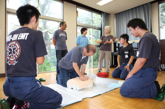 講師は湘央学園の学生さん達です。未来の救急救命士たちは、はじめこそガチガチに緊張した面持ちでしたが、応急処置のデモンストレーションに入ると切り替わり、迫真の演技に参加者たちも固唾を飲んで見学しておりました。講義を受けた後は2班に分かれて、心臓マッサージ・人工呼吸・AEDによる電気ショックの訓練です。「小指の長さ分沈む位の力で強く押してください!」と学生さんから声援が掛かる中、参加者たちは汗をかきながら懸命に心臓マッサージを行っておりました。