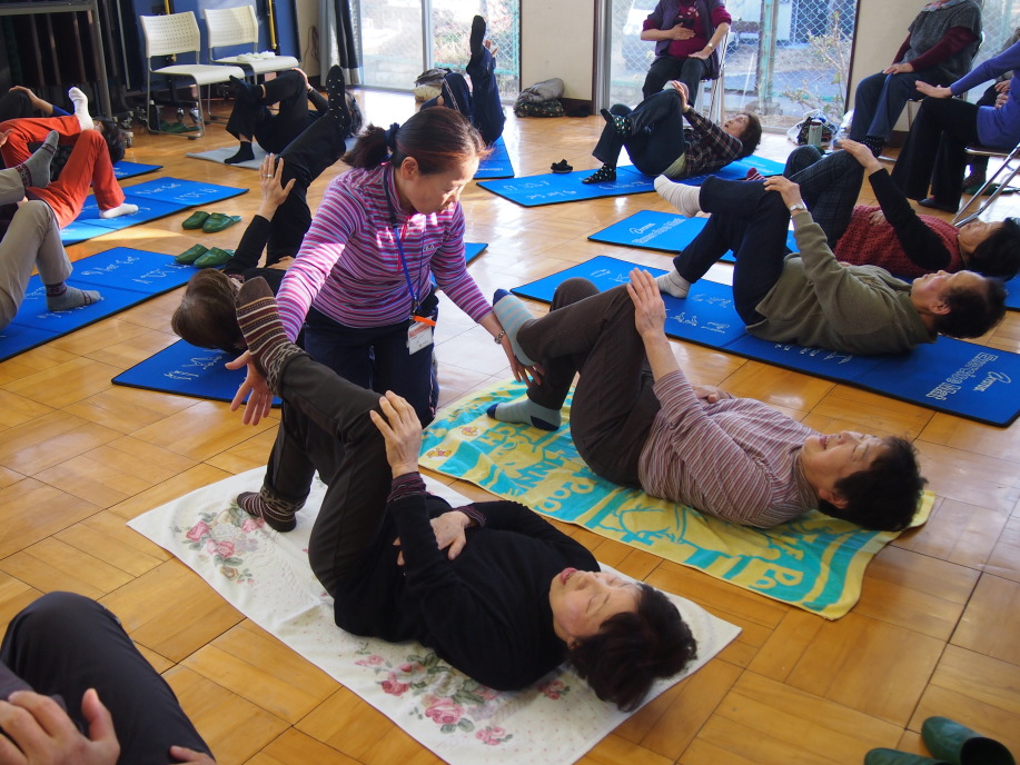 今は出来なくても大丈夫、必ず出来るようになります」と励ましてくれました。筋刺激体操では大きな声で6つ数えながら行います。(筋肉を鍛えるのに効果的な運動の条件は100%の力で6秒間だそうです)椅子に座ったまま手足を押したり引いたりする簡単な体操や、マットに寝て腹筋を鍛える体操などを行いました。その後ストレッチでリラックス。あっという間に2時間が過ぎていました。