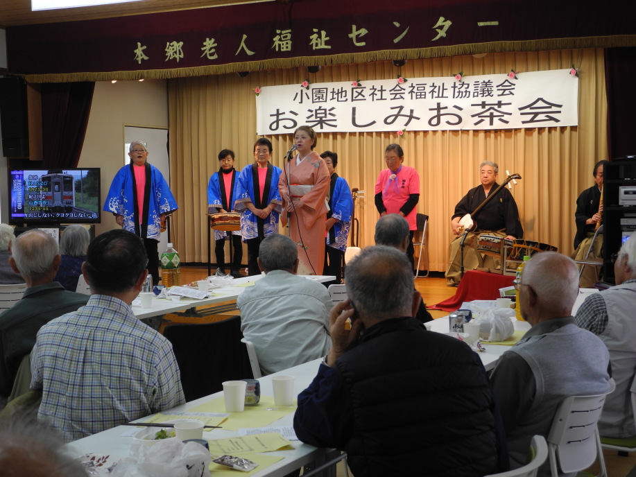 10月25日(水)本郷老人福祉センターで小園地区社会福祉協議会(以下:小園地区社協)主催の「お楽しみお茶会」が開催されました。小園地区在住の80歳以上の皆さんをお誘いしましたところ55名の方が参加され、民謡やフラダンス、カラオケを堪能され、楽しいひとときを過ごしていただきました。