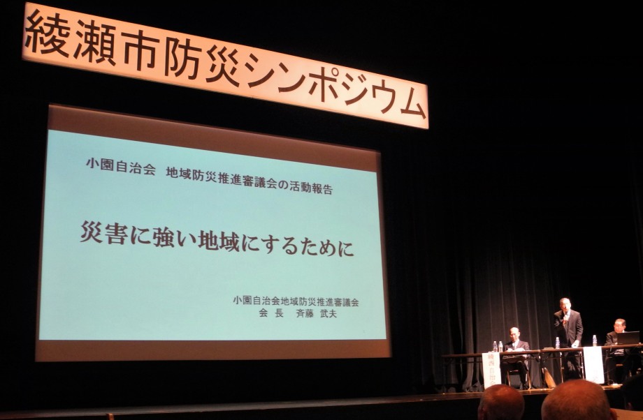 開催に当たり、古塩市長から「昨年は台風15号と19号が日本列島に上陸、襲来し全国各地に甚大な被害をもたらしました。今回の台風は今までの台風と違い、陸地に近づいても勢力が弱まらず、逆に発達しておりました。地球温暖化を象徴する現象です。これからはこのような台風が上陸することを想定した対策が必要になります。行政としては防災対策に加えて温暖化対策にも力を入れていく所存です。新年度においては車両を使った避難やペットを伴った避難者への対策なども進めていく所存です。自然災害を防ぐことはできません。しかし、地域と行政等が協力することで災害を最小限に抑えることはできます。そのためには日ごろから防災意識を高めていただくことが大切であります。本日の防災シンポジウムは『みんなで作る地域の防災力』をテーマに開催いたします。優良事例を共有していただき、地域防災力を高めていただきたいと存じます。第二部では、綾瀬市の防災アドバイザーである国崎信江氏に『地域の防災』にスポットを当てた講演を行っていただきます。」とあいさつがありました。