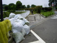 梅雨特有の蒸し暑く曇り空の日曜日の朝、10数名の皆さんが鎌や熊手などを手に集まり、作業が始まりました。雑草を刈り取る人、その雑草を袋詰めする人、運ぶ人と分担は自然に分かれ、作業は11時過ぎまで行われ、刈り取られた雑草は大きなビニール袋が50袋程になりました。この作業は目久尻川を管理する県から委託事業として行われました。