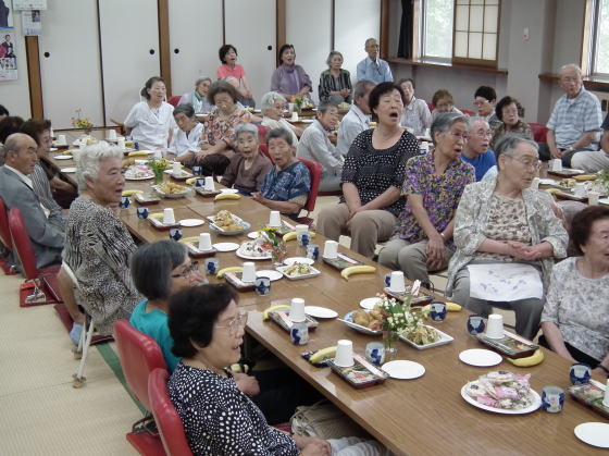 食後のカラオケも盛り上がり、とても75才以上の方とは思えないくらいの歌唱力は見事でした。予定時間となった午後2時半過ぎたには全員で青い山脈を合唱し、次の再開を楽しみにしつつバスに揺られて小園へ向かわれました。