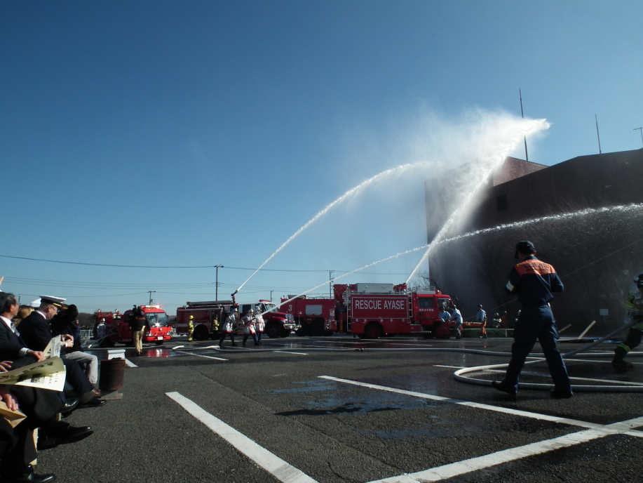 午前9時30花火の合図と共に開会のことば、市長の式辞、各種表彰、来賓挨拶と続き、第一部が終了した。第二部は婦人防火クラブの消防音頭、昨年度最優秀賞に輝いた綾西分団による操法演技、横浜乳業且ゥ衛消防隊の演技、消防署及び海上自衛隊厚木航空隊救難班、米軍厚木航空消防隊の合同演技が行われ、最後に一斉放水が行われました。消防署員の規律正しい姿勢やキビキビとした行動により新年がスタート致しました。
