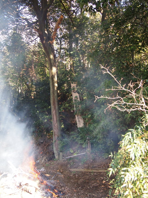 緑がうっそうとした古東海道(小園バス停付近)の脇、小さな道祖神の前で恒例のどんと焼きが行われました。