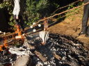 だんごは上新粉を練って丸めたものです。テニスボール位の大きさのだんごを木の枝の先が3本に別れているものに付けて火にかざします。木の枝がない人はアルミホイルで包み直接火の上に置いている人もいました。家族で来て、小さい子に合わせて小ぶりのだんごを焼いている人もいました。火の勢いが強いので表面が黒くなるのが早く、上手に焼くのが難しかったようですが、焼きあがっただんごを手に皆さん笑顔で帰っていかれました。