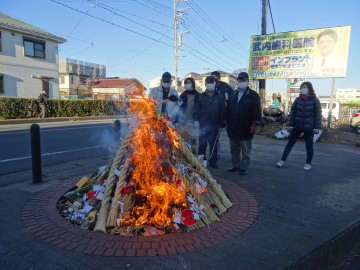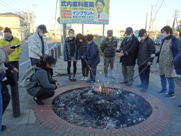| 毎年、1月14日(小正月)に、小園地区では、4箇所で「だんご焼き」の行事が行われます。 だんご焼きは、正月のしめ縄や門松、書初めなどを持ち寄り燃やし、その火でだんごを焼いて、一年間、風邪をひかない、病気にかからないなどの無病息災を願う古くから伝わる風習です。 今年、だんごを焼いていた皆さんは、特に、一日も早く、コロナが終息して、マスクなしで会話を楽しめるような日々になってほしいねとお願いしていました。 <小園子之社> だんご焼きを、下校中、見つけた小学生たちが、「何燃やしているの?」と興味深めに立ち寄っていました。だんご焼きの係の人に説明してもらっていましたが、「幼稚園でやったことがあるから知っているよ」とか「わぁ〜熱いね、煙いね、ここにいると、寄り道になるのかなー」と話していました。炎と煙の中、子ども達と一緒に、健康な一年を過ごせるようお願いしました。(寄り道の話は内緒です) <小園台第1公園> |